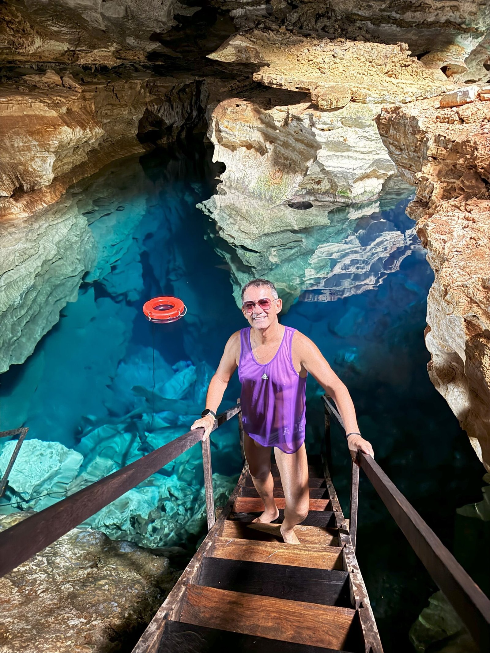 esse atrativo permite flutuar na caverna nas águas cristalinas e azuladas do lençol freático, o único esforço é apenas descer alguns degraus e nada mais!